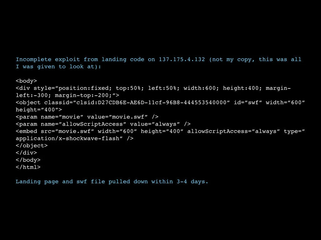Using an Adobe Flash exploit, a vulnerable swf file was served up (see Figure 3). The vulnerability was exploited to perform one action, a download of a RAT (Remote Access Trojan) associated with Wekby.