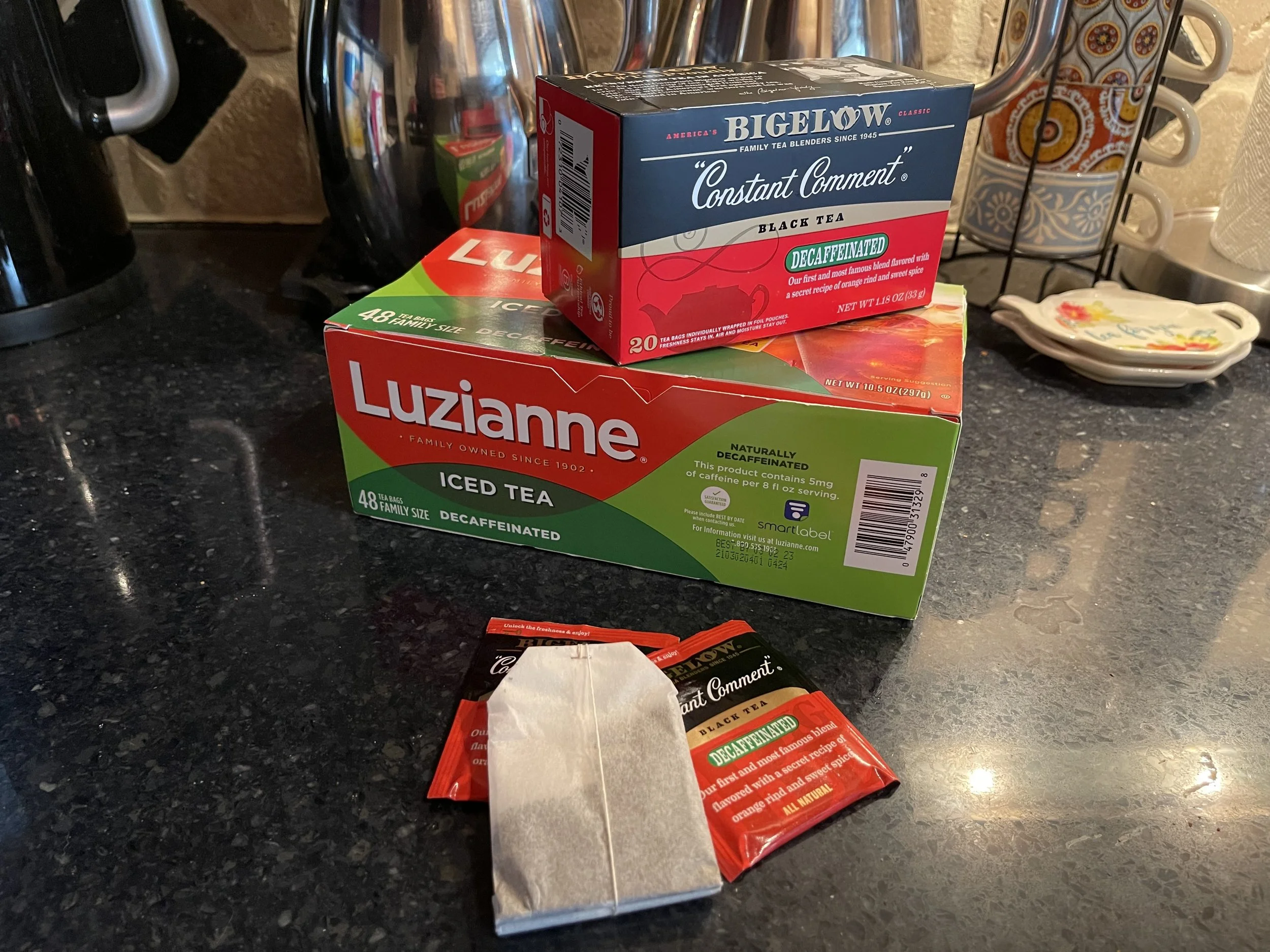 Pictured above are the decaff versions of Luzianne and Constant Comment, so if caffeine keeps you up at night feel free to go this route. I fill a pitcher with nearly a gallon of boiling water with these tea bags, and let it steep until the water is room temperature. I usually have it without ice as I prefer it at room temperature anyway. People that come over and have this iced tea for the first time always remark it is the best iced tea they’ve ever had.
