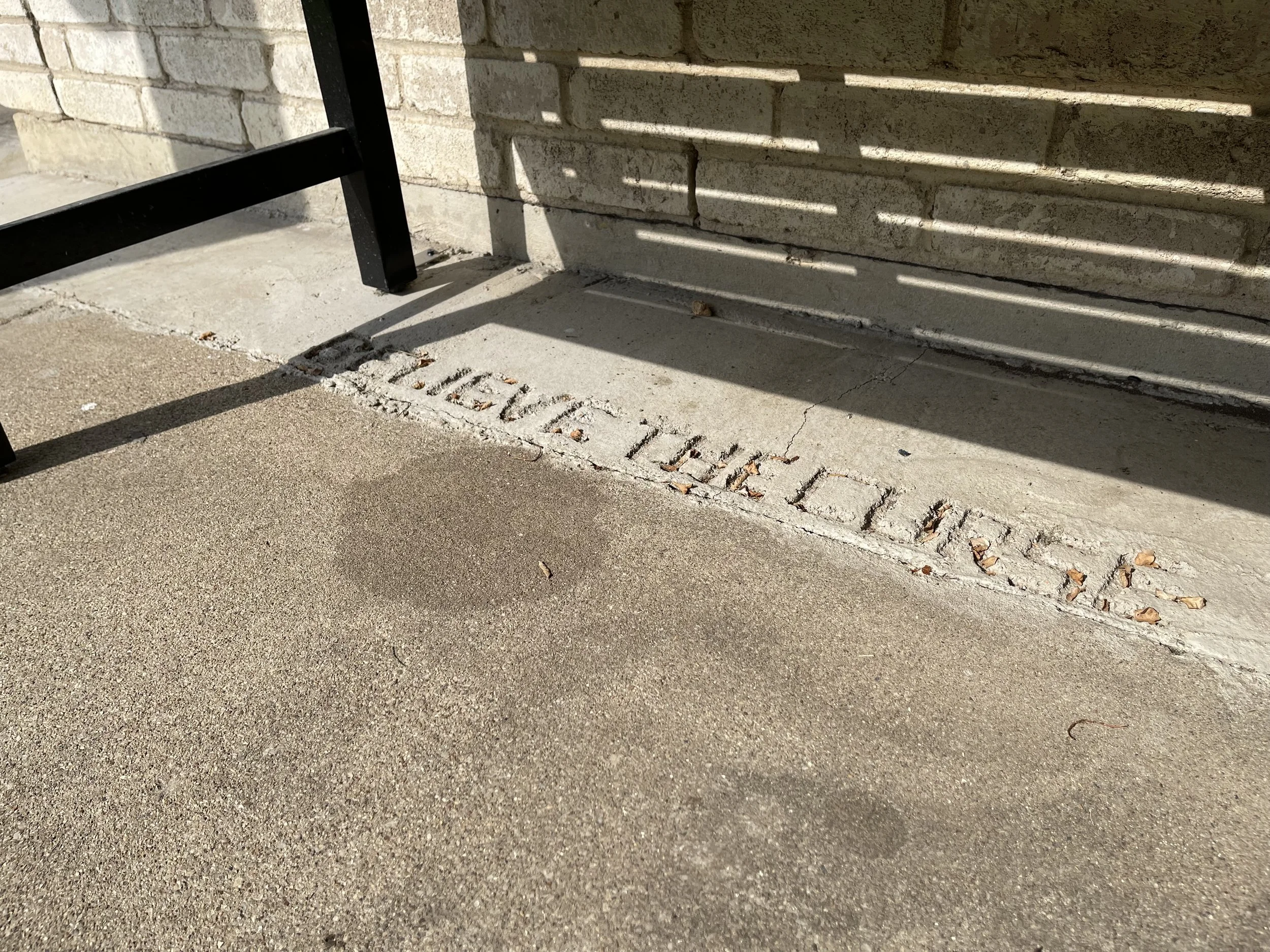 Anyway, when burying a pole to be used for a basketball goal for the kids next to the driveway, in the wet cement we etched in this family motto. In a few short years, dirt and grass slowly sank the cement by a small amount, and after the kids had moved out the pole was cut off at this base. So now, underneath a couple of inches of soil and grass lies a rather odd reminder of a family joke from long ago that will make no sense to a future homeowner that discovers it.
