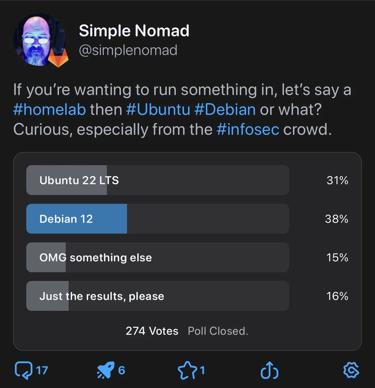 I ran a poll on Mastodon, where I specifically asked about running Debian vs Ubuntu. I was genuinely curious what people though about it, and did this about halfway through my testing. I was genuinely surprised how many people were running Debian (or at least spoke up about it) in my rather non-scientific poll. Here are the results: